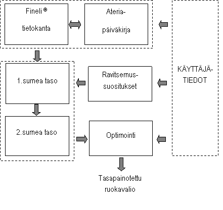 Ateriapäiväkirjan ja täydennetyn Fineli®-tietokannan pohjalta laskettu ravintoaineiden päivittäinen saanti muutetaan sumean systeemin ymmärtämään muotoon, jonka jälkeen sääntöjen pohjalta päätellään tarvittavat muutokset ruokavalion tasapainottamiseksi. Tuloksena on lista lisättäväksi ja vähennettäväksi ehdotetuista ruoista. Ratkaisuista optimaalisin yhdistelmä haetaan geneettisiä algoritmeja käyttäen. Ehdotetuilla muutoksilla ruokavaliota tasapainotetaan niin, että se poikkeaisi mahdollisimman vähän suosituksista. Alkuperäistä ruokavaliota pyritään muuttamaan vain sen verran, että ohjeistuksen noudattaminen olisi mahdollista ja mielekästä. Käyttäjälle annetaan sanallinen ohjeistus, jossa vähennettäväksi ja lisättäväksi ehdotetut ruoat tuodaan esille.